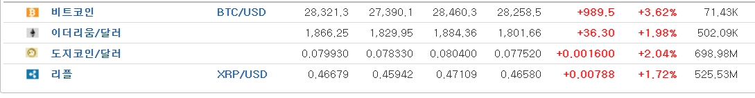 대형 기술기업인 빅테크 기업들의 실적 발표에 비트코인이 급등하며 2만8000달러를 재돌파했다.26일 26일 오전 7시18분 현재 글로벌 코인시황 중계사이트인 코인마켓캡에서 비트코인은 24시간 전